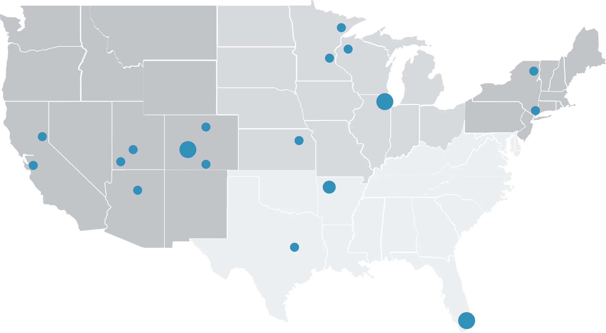 map of the USA with blue dots indicating the locations of the events